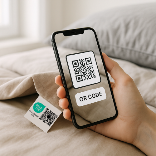 – oraz kod QR, który przenosi Cię bezpośrednio do strony OEKO-TEX® Label Check, gdzie możesz zweryfikować autentyczność i ważność certyfikatu.