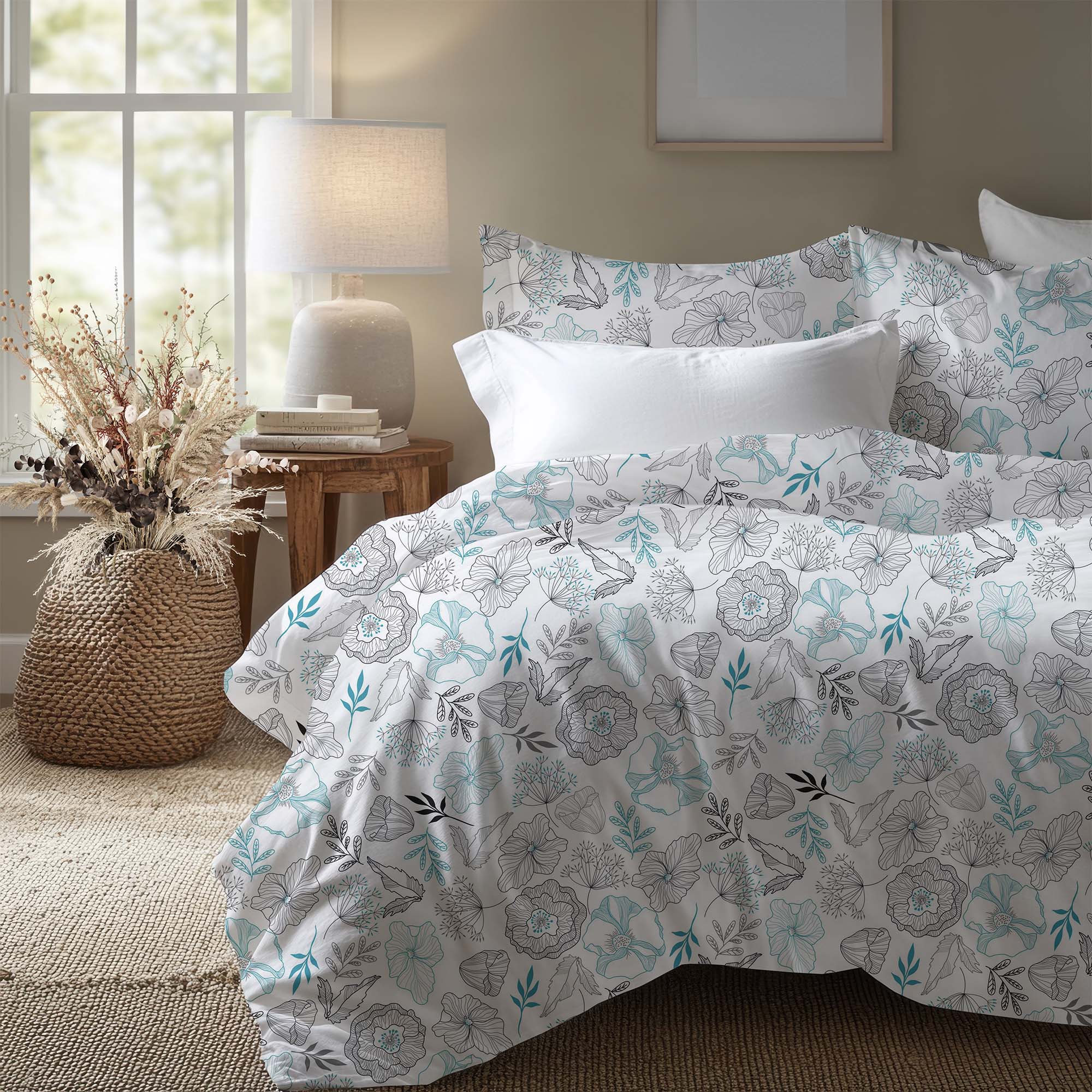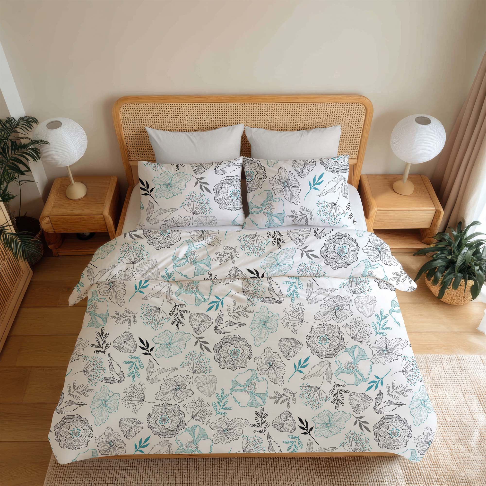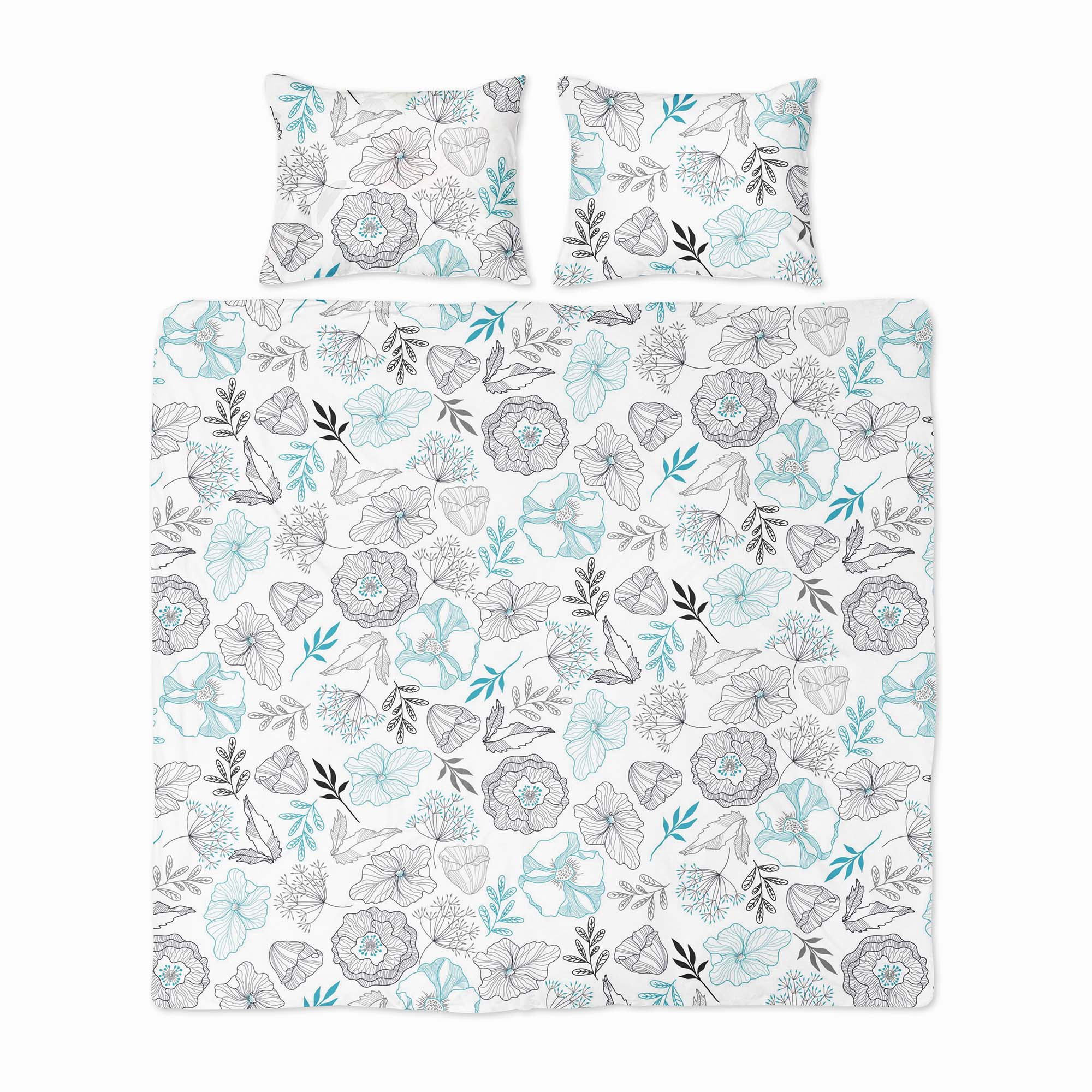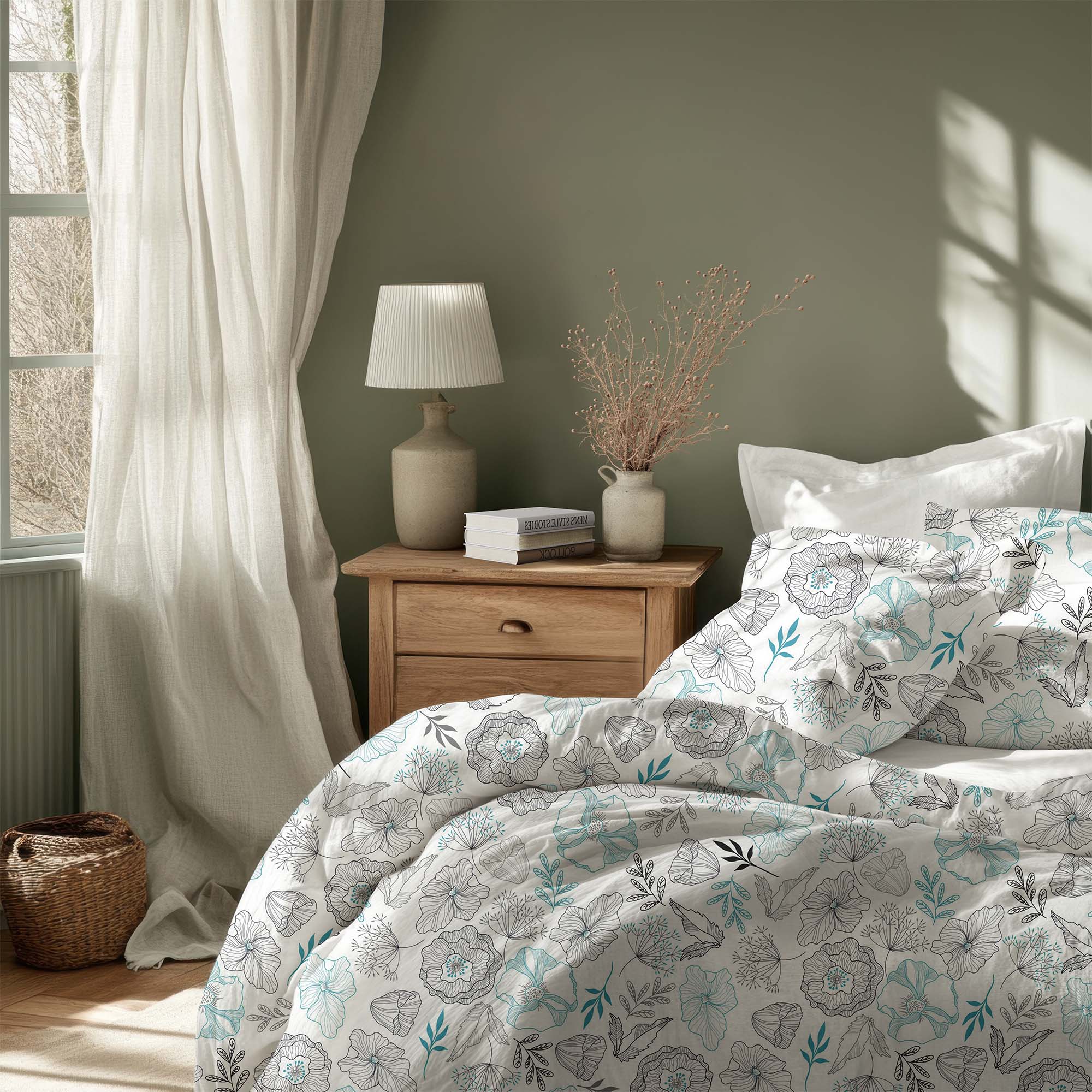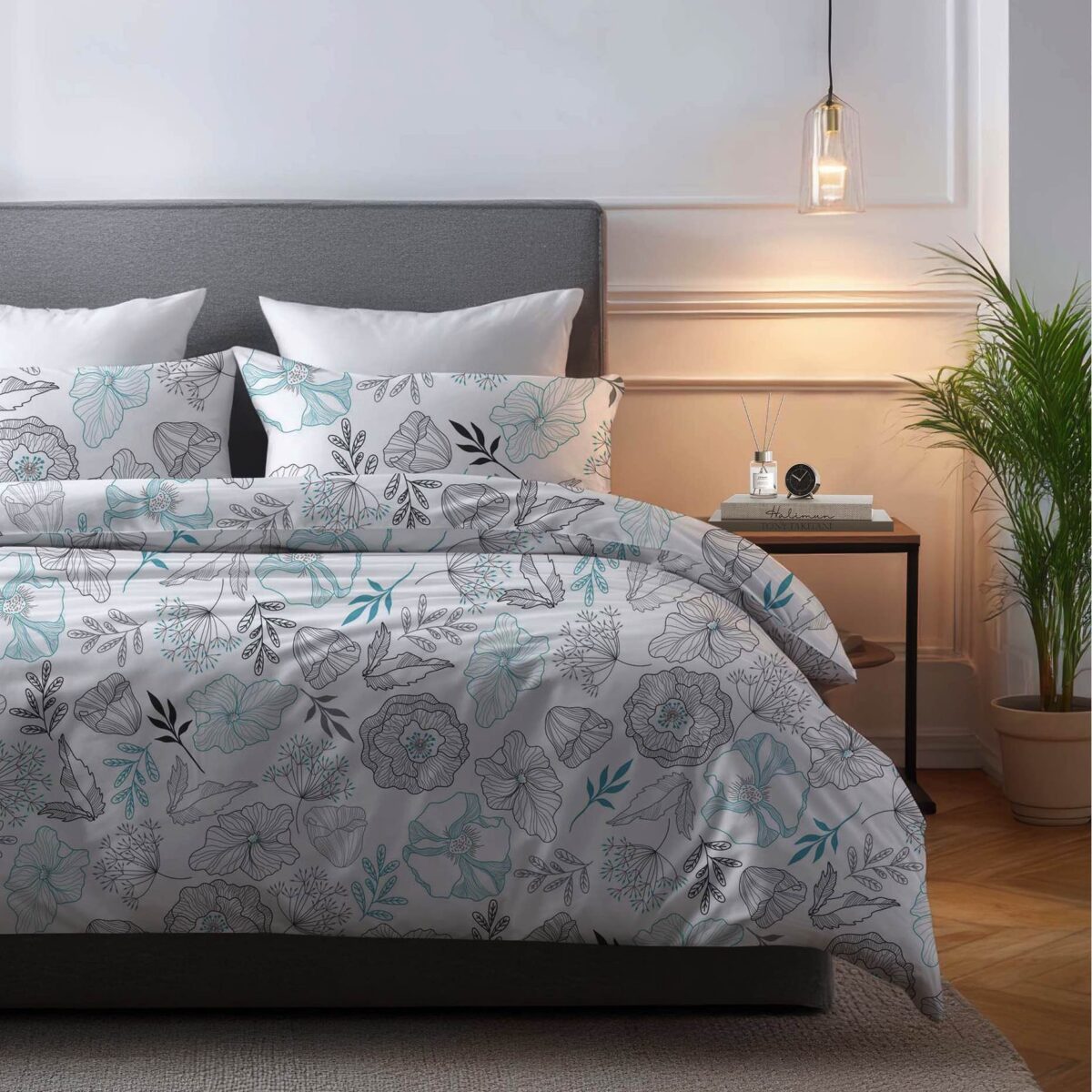 Pościel w białym odcieniu z delikatnym wzorem kwiatów to propozycja pełna lekkości i subtelnej elegancji. Motywy florystyczne w odcieniach chłodnego błękitu i stonowanej szarości tworzą harmonijną, uporządkowaną kompozycję, która wprowadza do sypialni atmosferę świeżości, spokoju i wizualnej lekkości. Całość doskonale wpisuje się w nowoczesne, skandynawskie i minimalistyczne wnętrza — dla osób ceniących ponadczasowy styl i delikatny, estetyczny design.