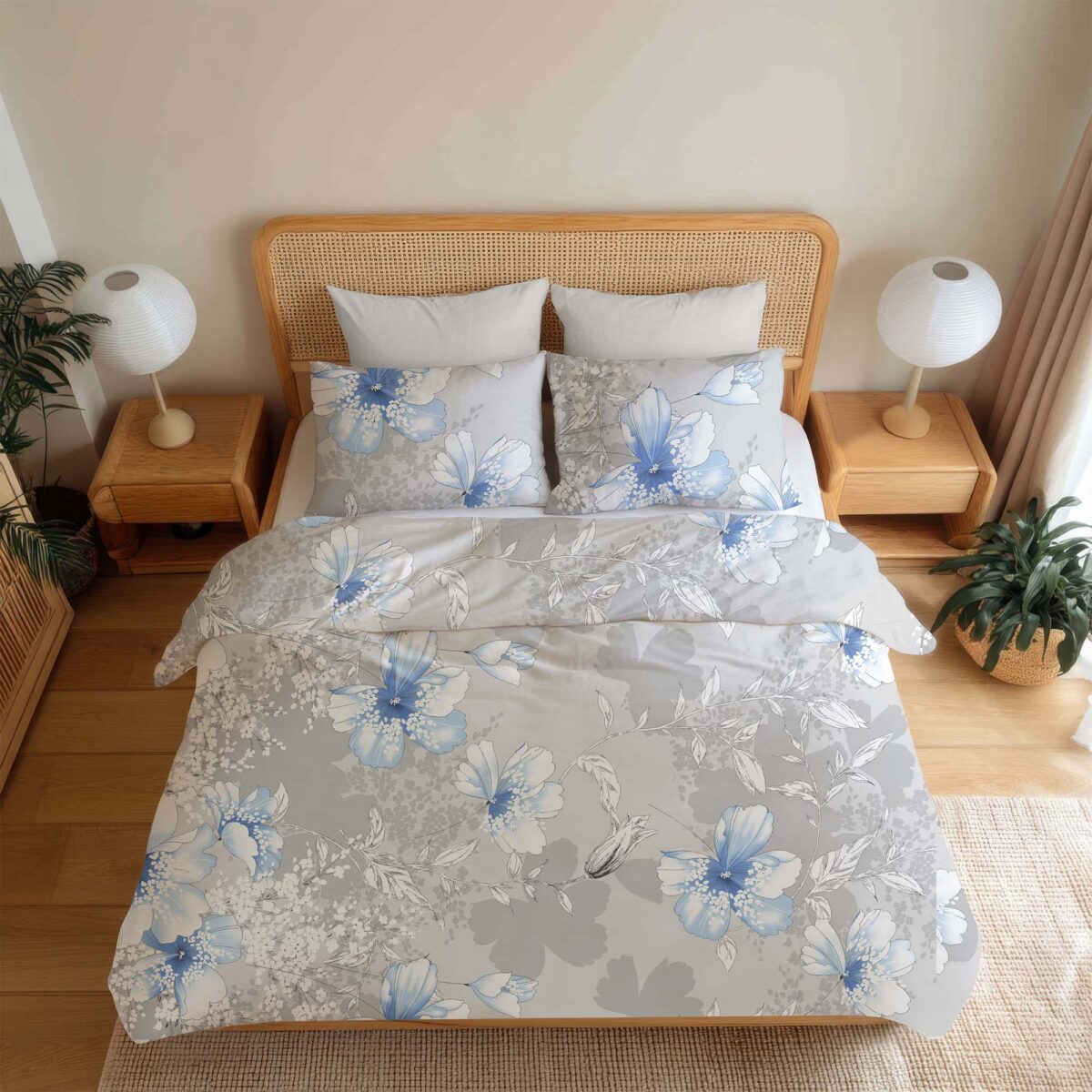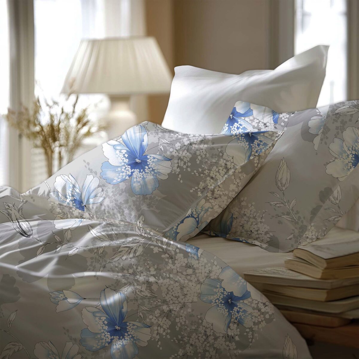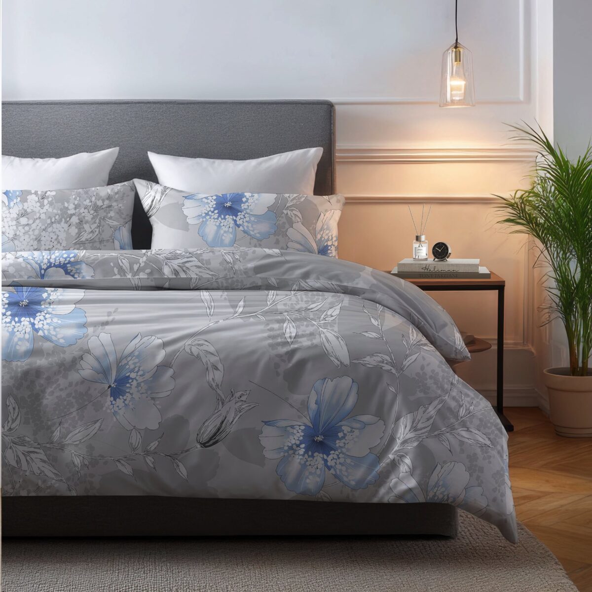 Pościel Bawełniana Błękitne Kwiaty w Szarości