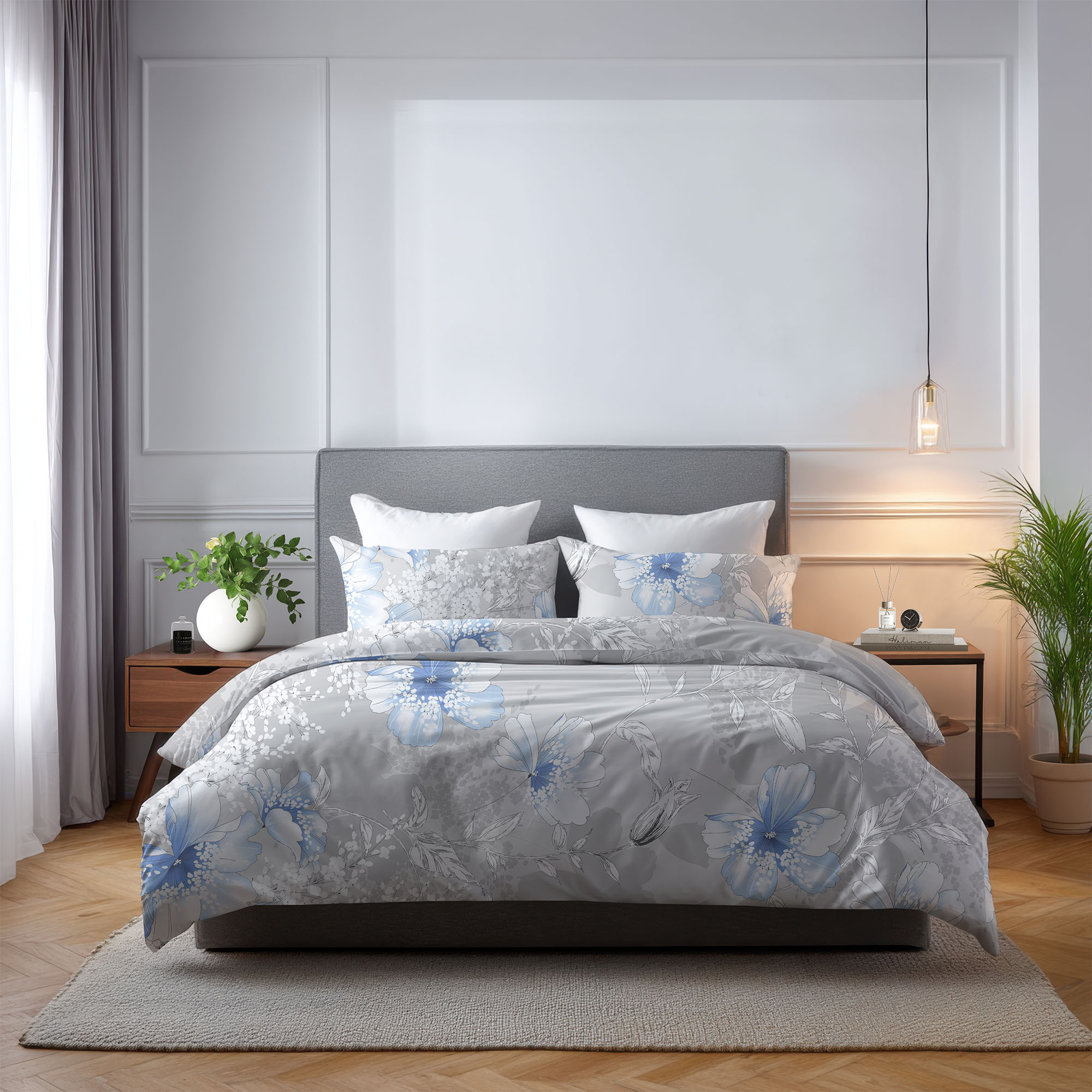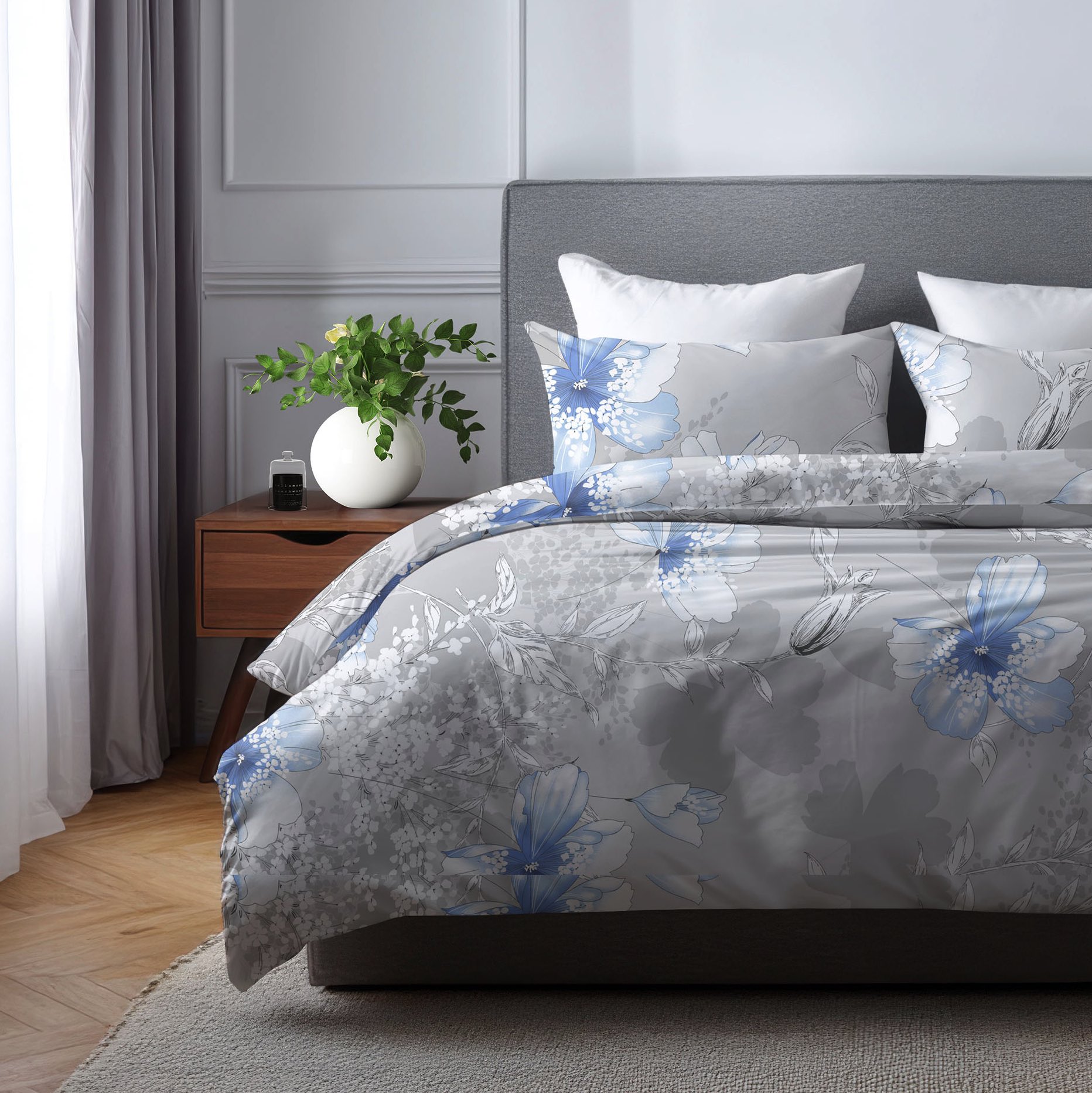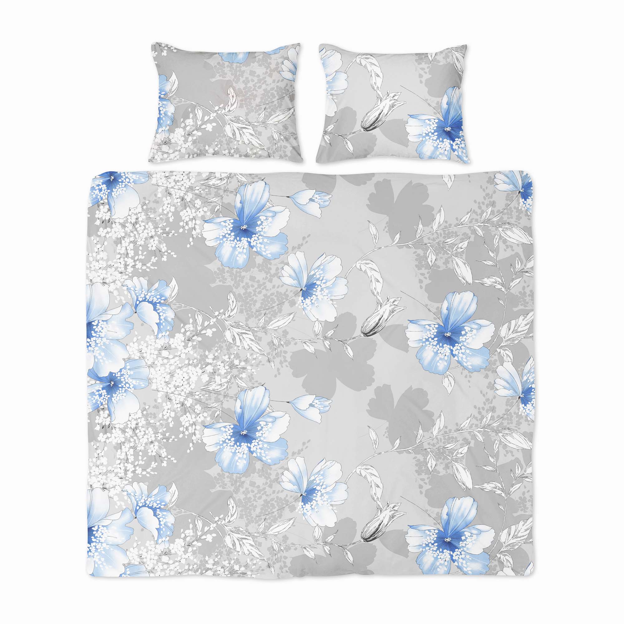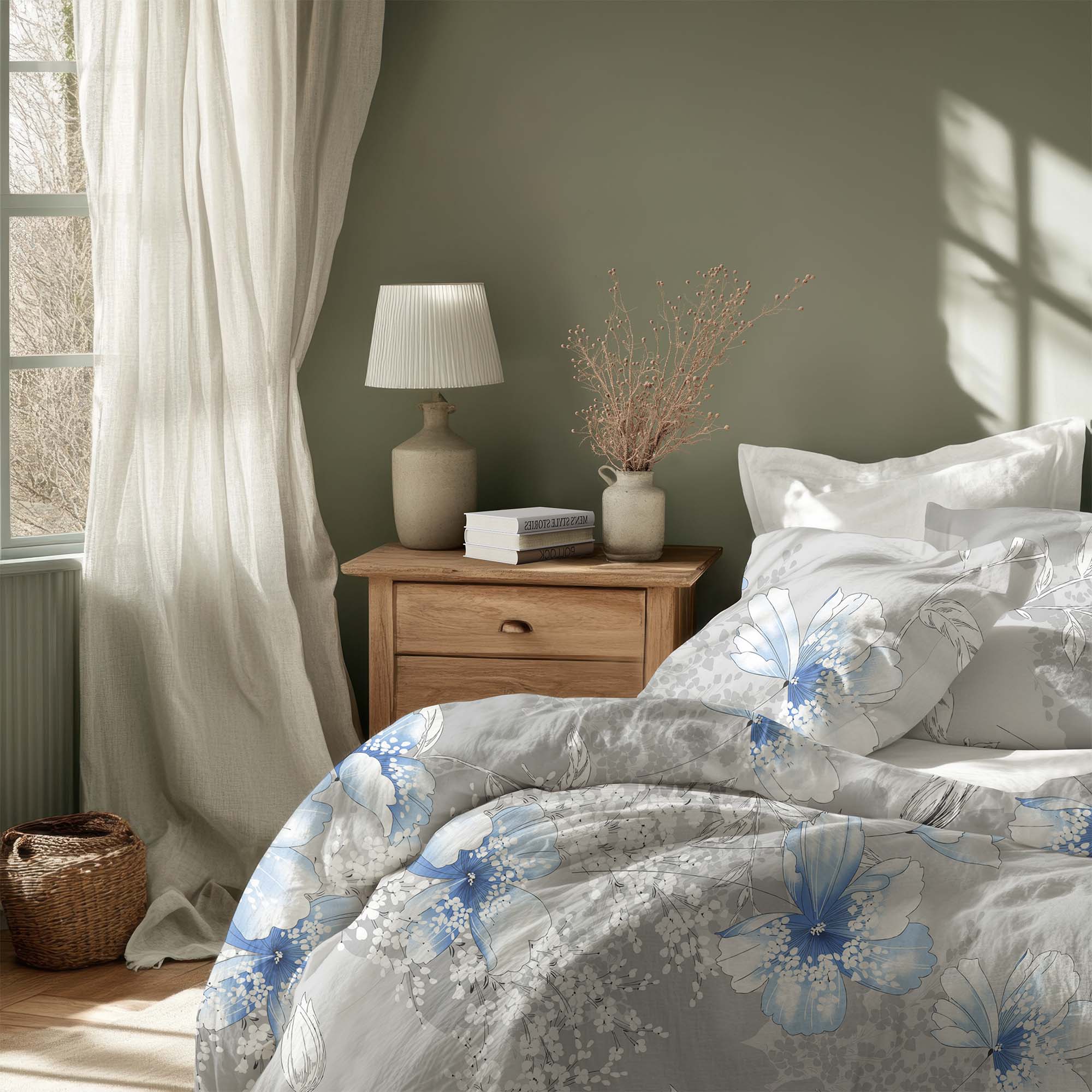Pościel Bawełniana Błękitne Kwiaty w Szarości