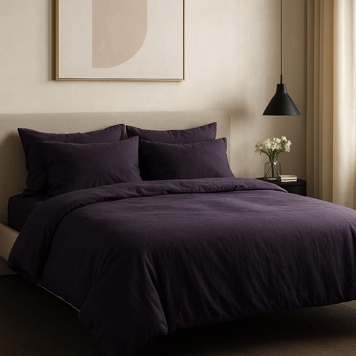 Pościel VelvetHome w bakłażanowym odcieniu fioletu to wyrazisty akcent dla eleganckiej sypialni. Głęboka, naturalna barwa wprowadza do wnętrza ciepło, spokój i wyjątkowy charakter. Doskonale komponuje się zarówno z nowoczesnymi, jak i klasycznymi aranżacjami.