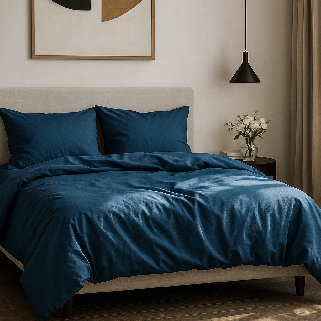 Pościel w odcieniu ciemnoniebieskim VelvetHome to elegancki i wyrazisty kolor, który nadaje sypialni głębi i charakteru. Jego intensywny ton pięknie komponuje się z nowoczesnymi, loftowymi i klasycznymi aranżacjami. To wybór dla osób, które chcą stworzyć atmosferę spokoju z nutą luksusu.