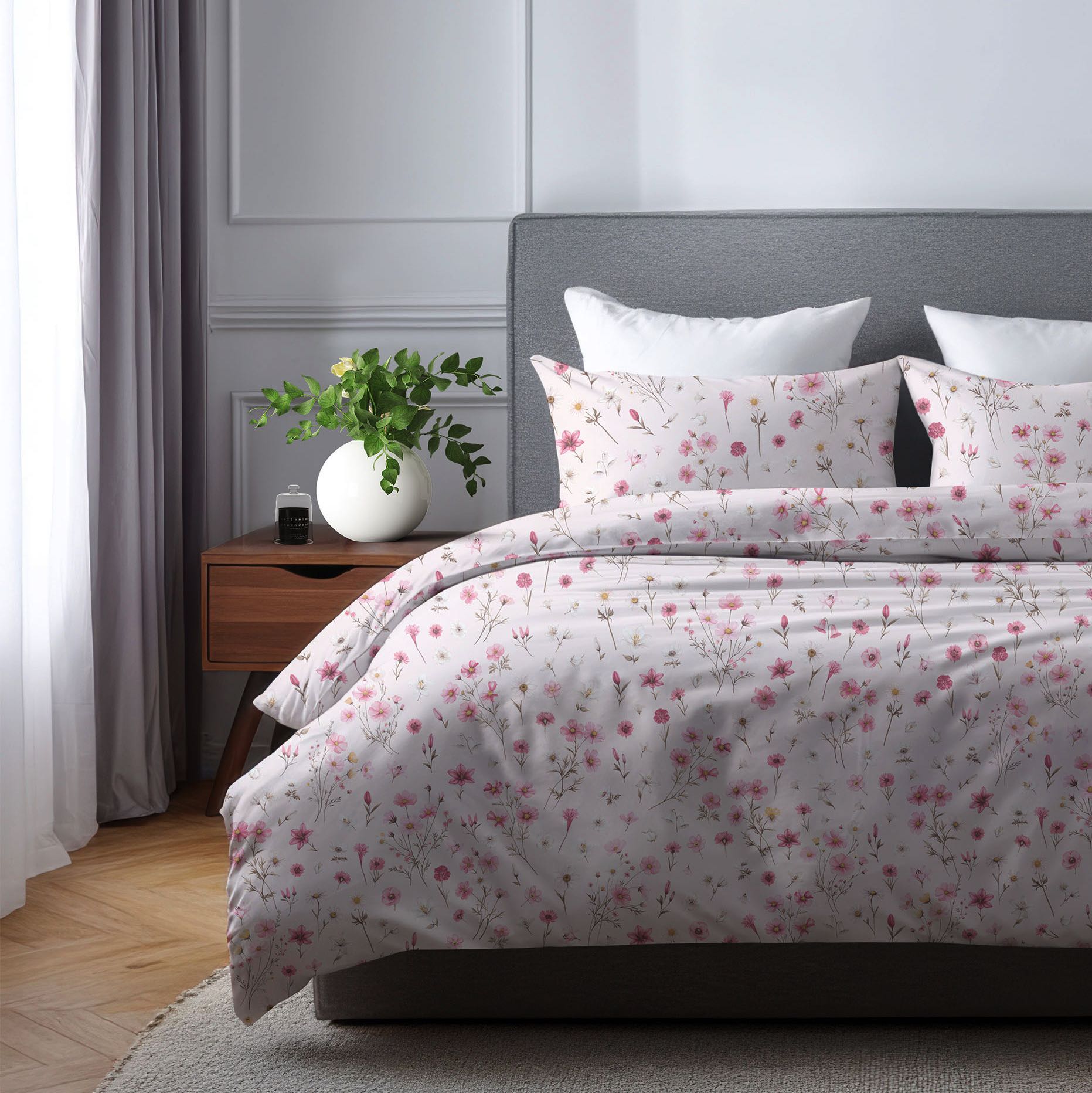 Pościel Czuła Chwila to wzór inspirowany delikatnością natury i spokojem chwil przeznaczonych tylko dla siebie. Jasne tło zdobią drobne, pastelowe kwiaty w odcieniach różu oraz subtelnej zieleni, tworząc lekką i harmonijną kompozycję przypominającą kwitnącą łąkę. Subtelny wzór wprowadza do sypialni atmosferę ciepła, relaksu i romantycznej lekkości, sprzyjając spokojnemu odpoczynkowi i regeneracji. To idealny wybór do wnętrz w stylu romantycznym, skandynawskim i klasycznym — dla osób, które cenią delikatne wzory i przytulny klimat sypialni.