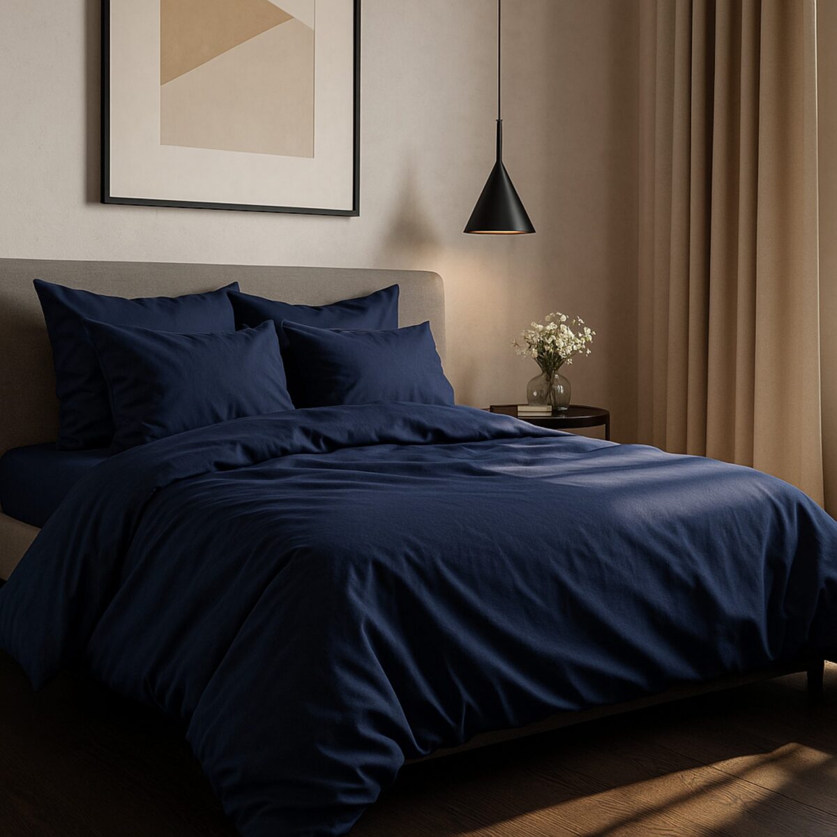 Pościel w odcieniu granatowym VelvetHome to klasyczny i elegancki kolor, który dodaje sypialni szyku i wyrazistości. Głęboki granat pięknie komponuje się z nowoczesnymi, loftowymi i minimalistycznymi aranżacjami. To idealny wybór dla osób, które cenią ponadczasową estetykę i chcą wprowadzić do wnętrza nutę luksusu.