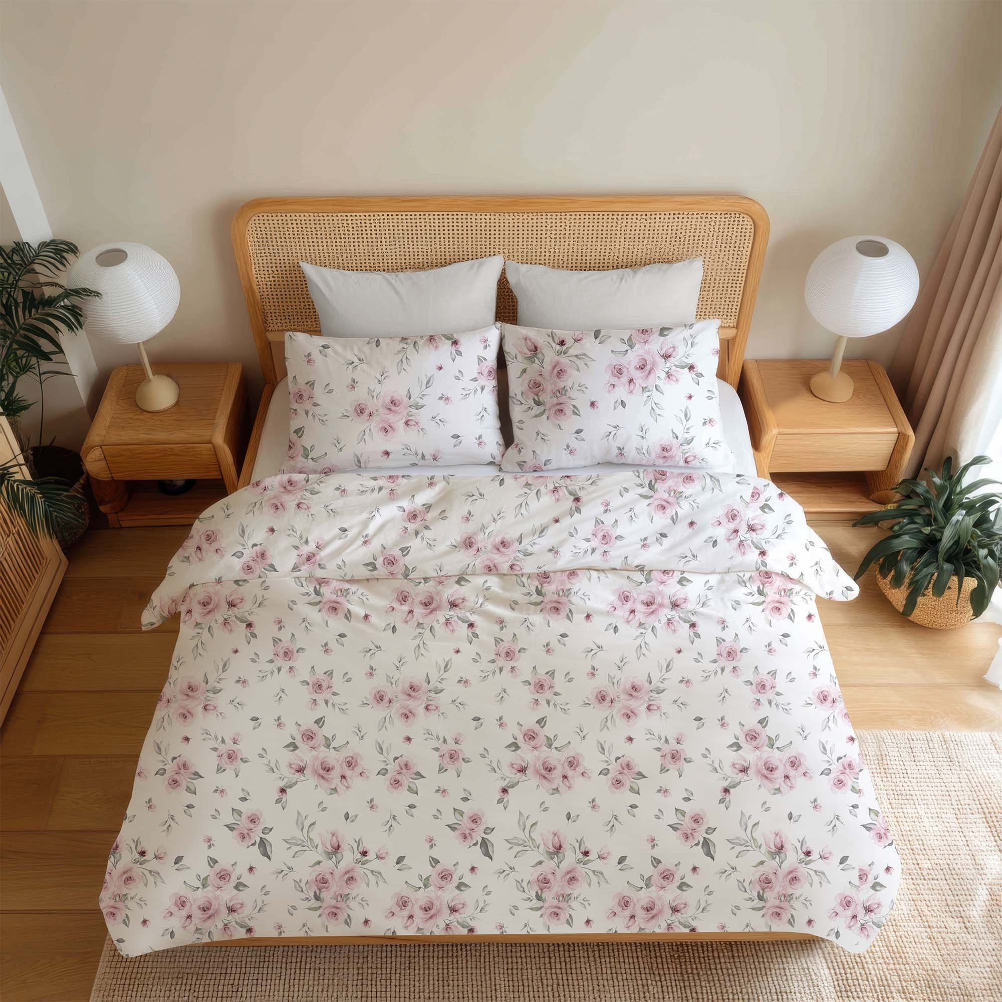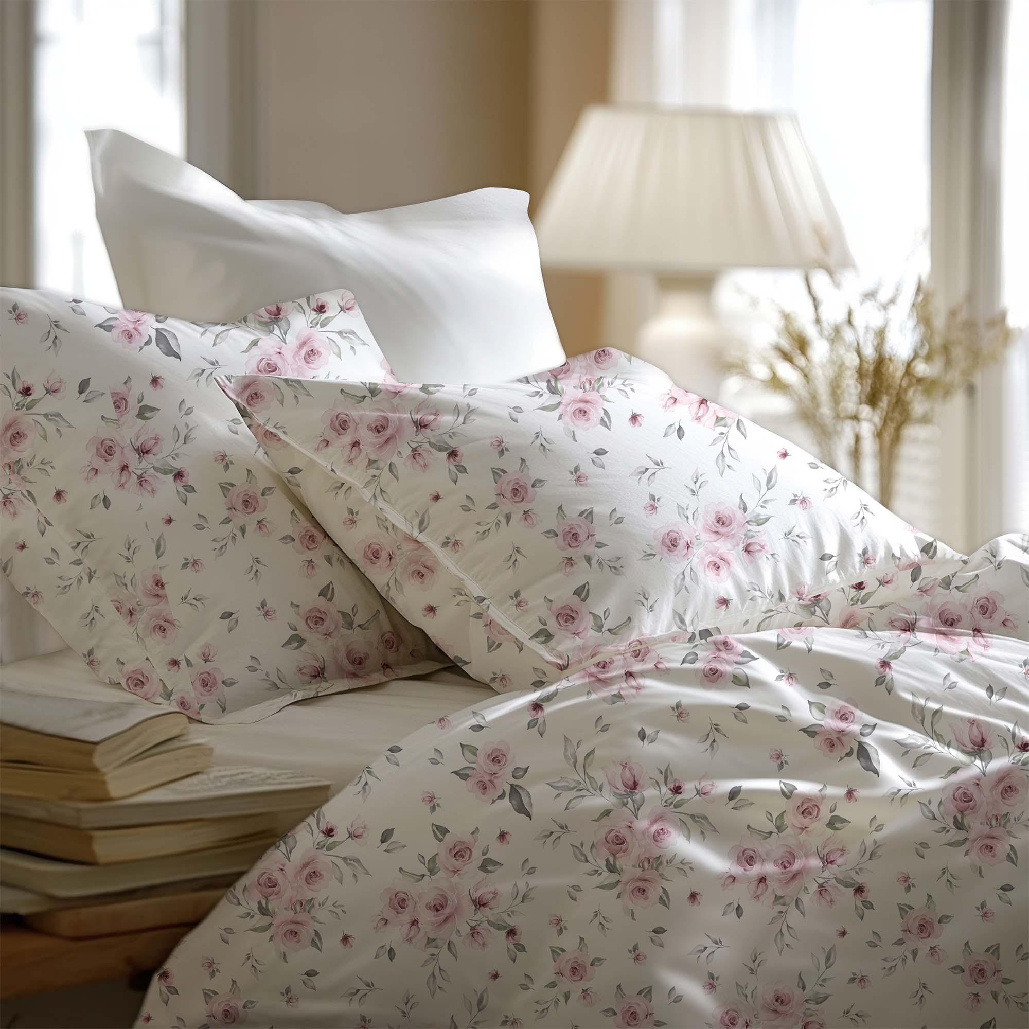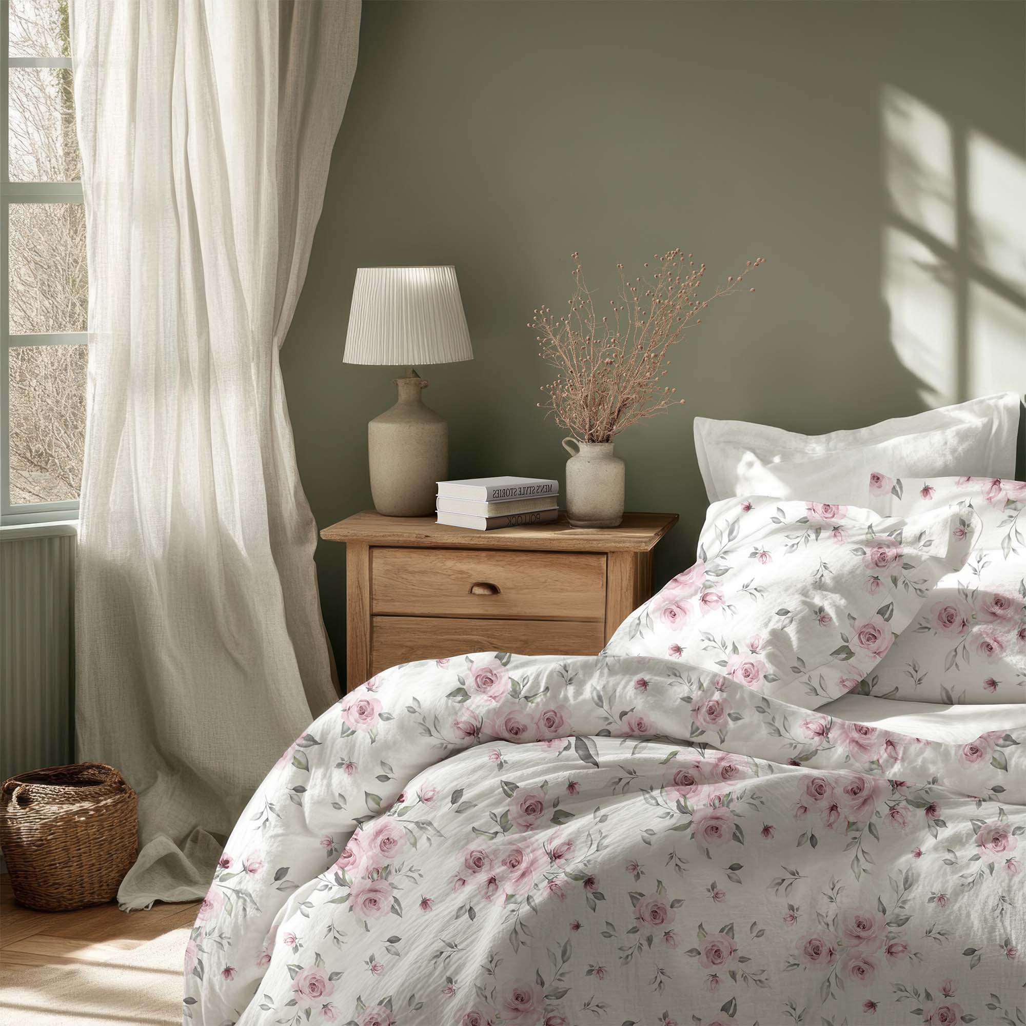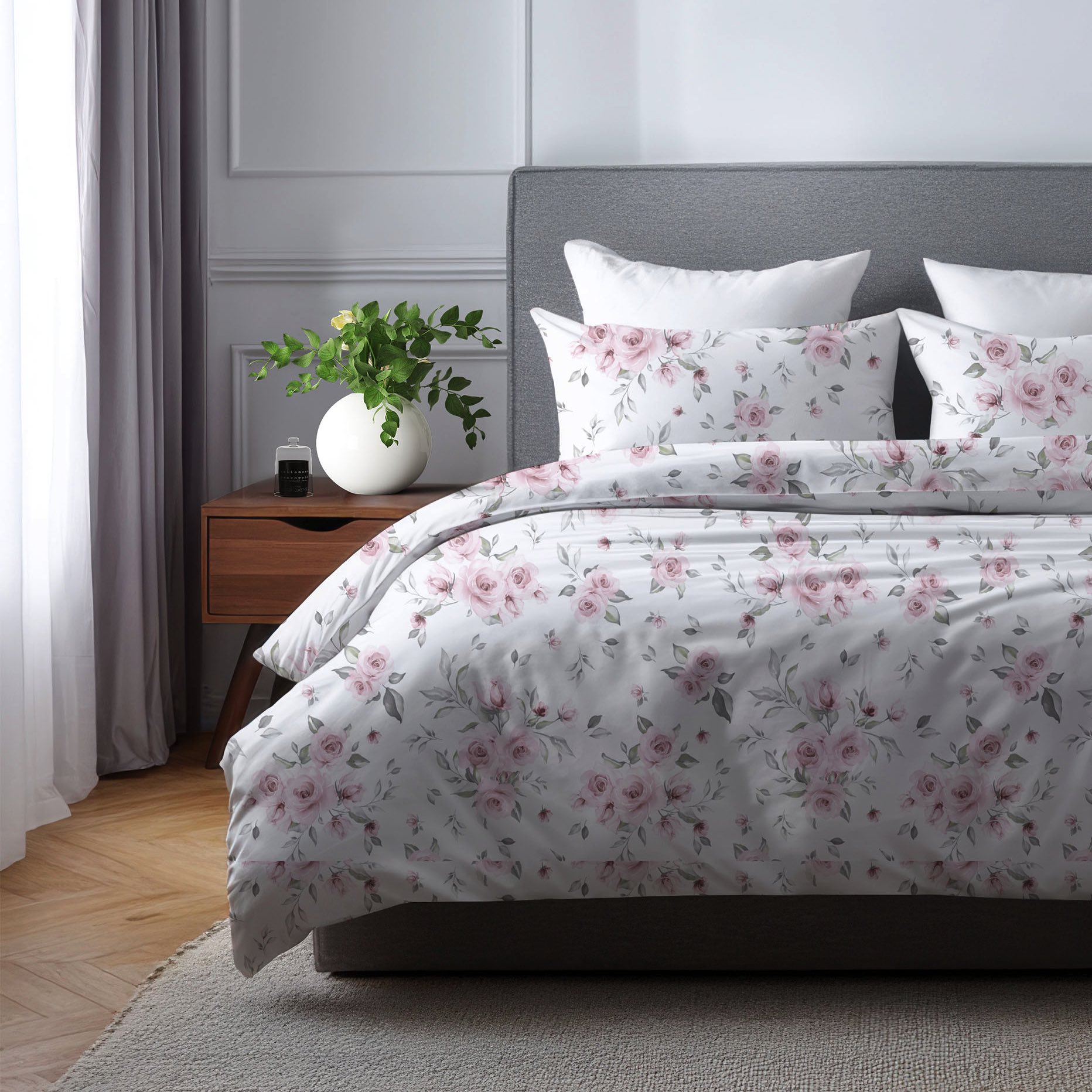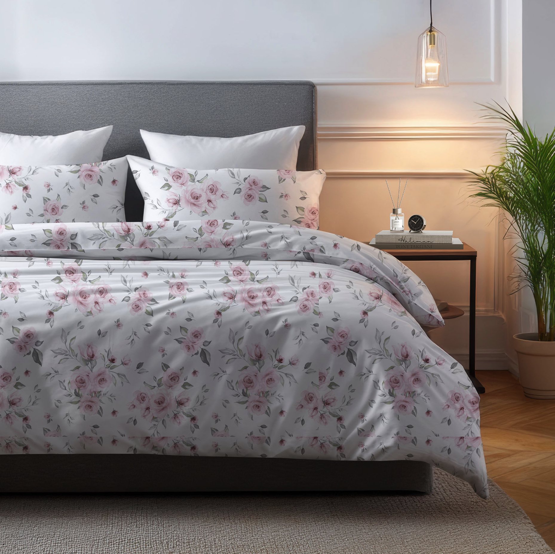 Pościel Romantyczne Róże to połączenie delikatności i ponadczasowej elegancji inspirowanej klasycznymi motywami kwiatowymi. Jasne, białe tło zdobią subtelne róże w odcieniach różu, uzupełnione delikatną zielenią liści, tworząc lekką i harmonijną kompozycję. Wzór wprowadza do sypialni atmosferę przytulności, spokoju i kobiecej subtelności, sprzyjając codziennemu relaksowi oraz komfortowemu wypoczynkowi. To idealny wybór do wnętrz w stylu romantycznym, klasycznym i boho — dla osób ceniących delikatny design i ponadczasowe piękno.