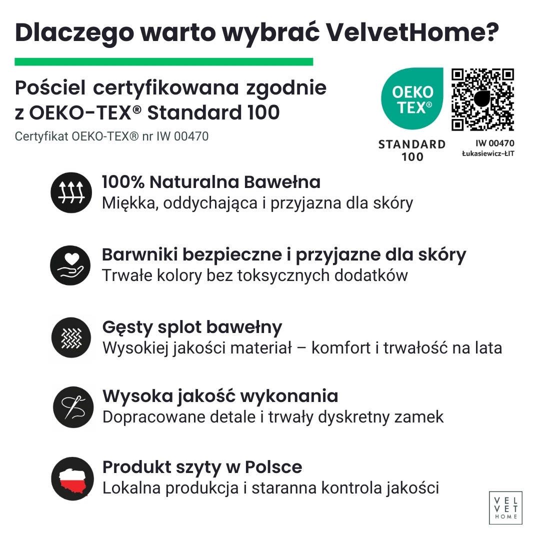 Solidne szwy, trwały nadruk i precyzyjne wykończenie sprawiają, że produkty VelvetHome zachowują swój wygląd i właściwości nawet po wielu praniach.