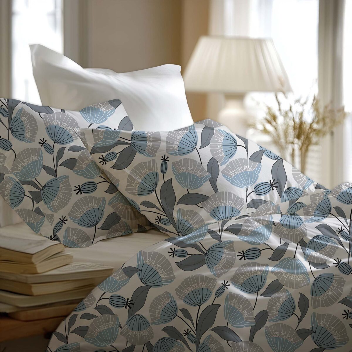 Pościel Skandynawski Ogród to połączenie nowoczesnej elegancji i naturalnej harmonii inspirowanej skandynawskim stylem. Jasne tło zdobią stylizowane motywy kwiatów i liści w odcieniach chłodnego błękitu oraz stonowanej szarości, tworząc spokojną i uporządkowaną kompozycję. Błękitno-szara kolorystyka wprowadza do sypialni atmosferę świeżości, lekkości i wizualnego ładu, sprzyjając codziennemu relaksowi i regeneracji. To idealny wybór do wnętrz w stylu nowoczesnym, skandynawskim i minimalistycznym — dla osób ceniących jasne barwy, naturalną estetykę i ponadczasowy design.