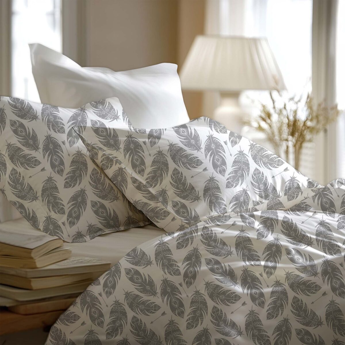 Pościel Szare Pióra to połączenie subtelnej lekkości i nowoczesnej elegancji inspirowanej motywem delikatnych piór. Jasne, białe tło zdobią stylizowane wzory piór w odcieniach stonowanej szarości, tworząc spokojną i harmonijną kompozycję. Wzór wprowadza do sypialni atmosferę wyciszenia, porządku i wizualnej lekkości, sprzyjając codziennemu relaksowi i komfortowemu wypoczynkowi. To idealny wybór do wnętrz w stylu nowoczesnym i minimalistycznym — dla osób ceniących prostotę, elegancję i ponadczasowy design.