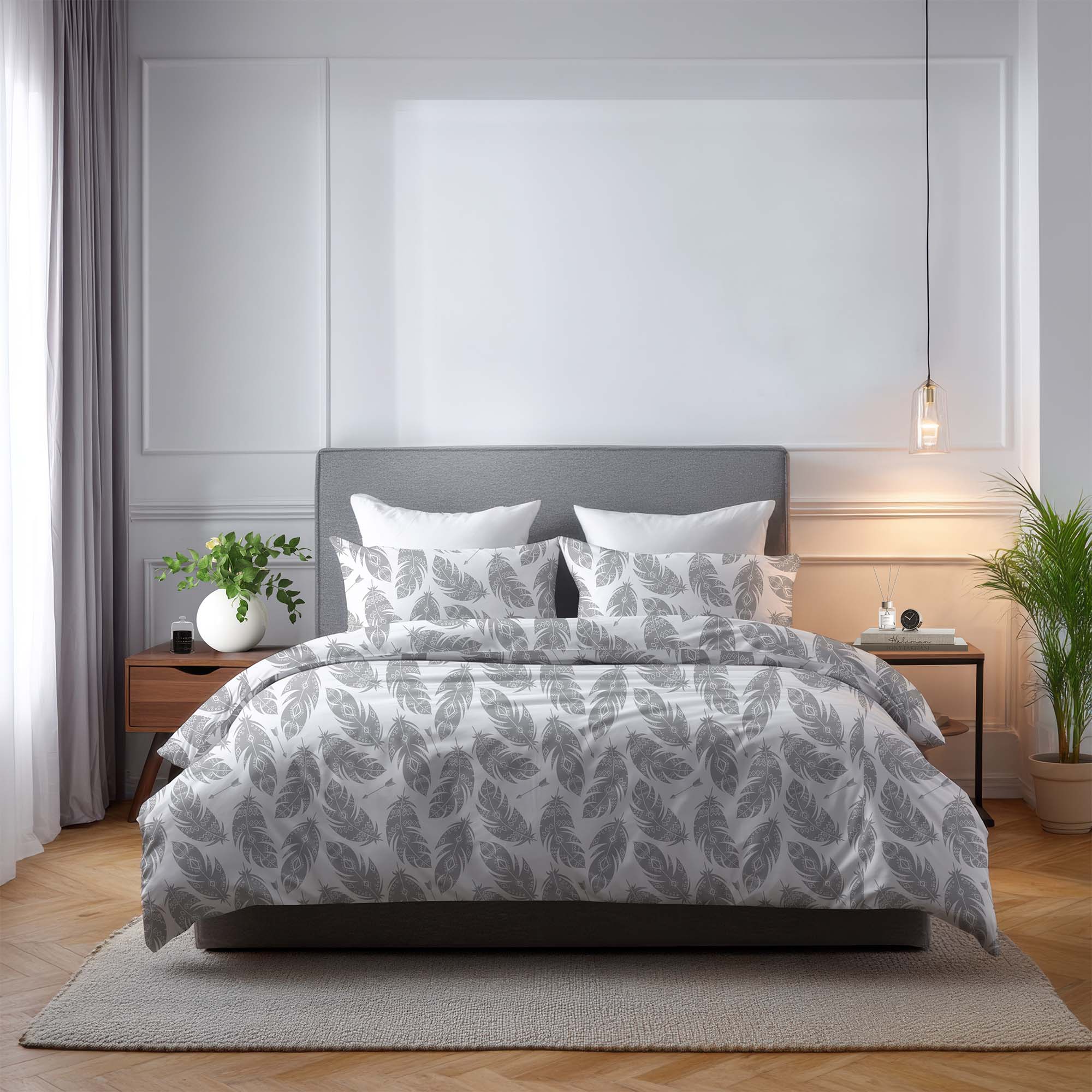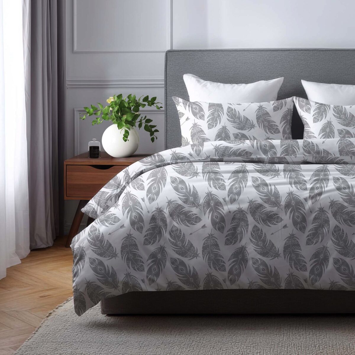 Pościel Szare Pióra to połączenie subtelnej lekkości i nowoczesnej elegancji inspirowanej motywem delikatnych piór. Jasne, białe tło zdobią stylizowane wzory piór w odcieniach stonowanej szarości, tworząc spokojną i harmonijną kompozycję. Wzór wprowadza do sypialni atmosferę wyciszenia, porządku i wizualnej lekkości, sprzyjając codziennemu relaksowi i komfortowemu wypoczynkowi. To idealny wybór do wnętrz w stylu nowoczesnym i minimalistycznym — dla osób ceniących prostotę, elegancję i ponadczasowy design.