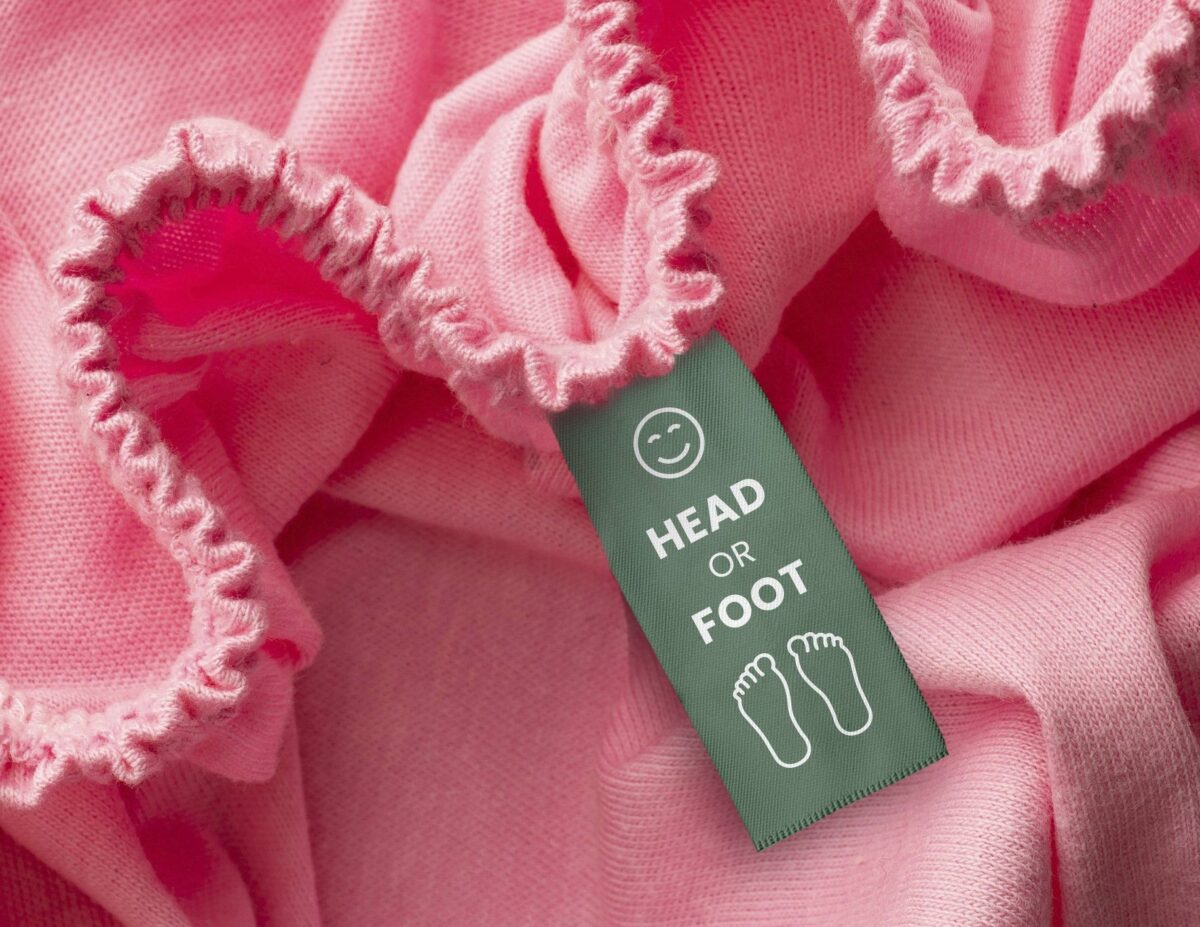 - Praktyczna metka „Head or Foot” ułatwia zakładanie, wskazując właściwy kierunek ułożenia na materacu.